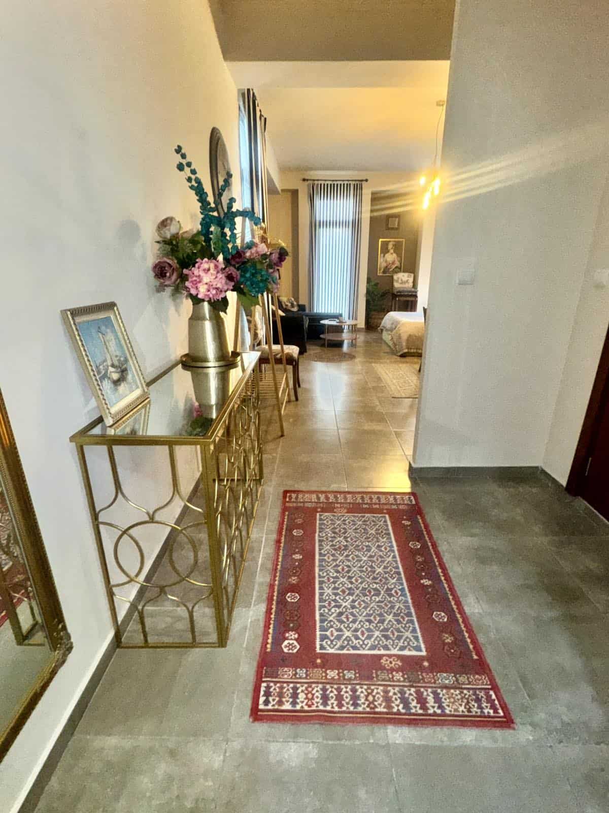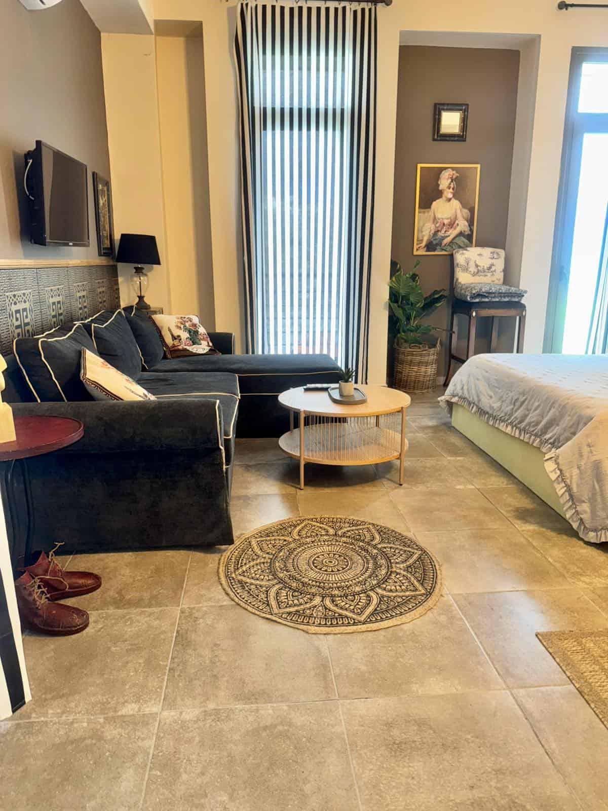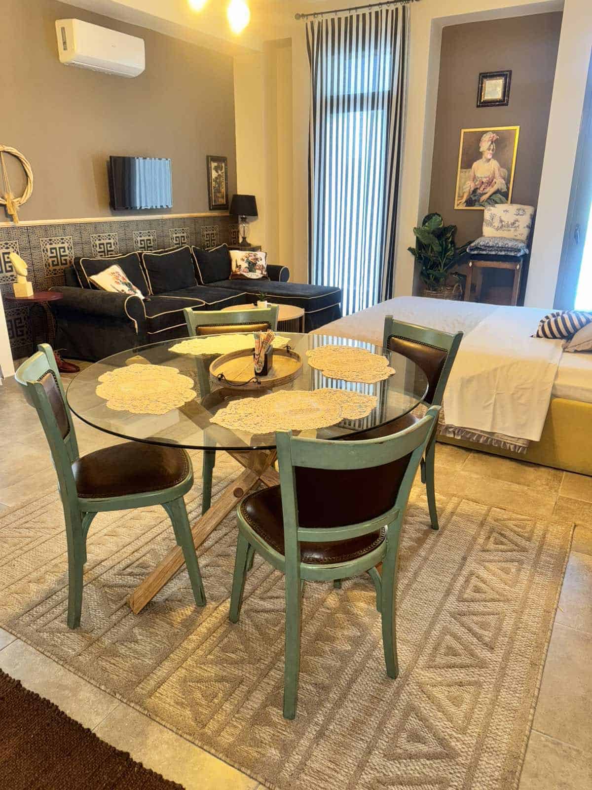 Η διακόσμηση συνδυάζει minimal αισθητική με μοντέρνα έπιπλα, πίνακες και υφές που δημιουργούν μια ζεστή, οικεία ατμόσφαιρα. Ο καναπές και η μικρή τραπεζαρία ολοκληρώνουν τον χώρο με λειτουργικότητα και άνεση.
