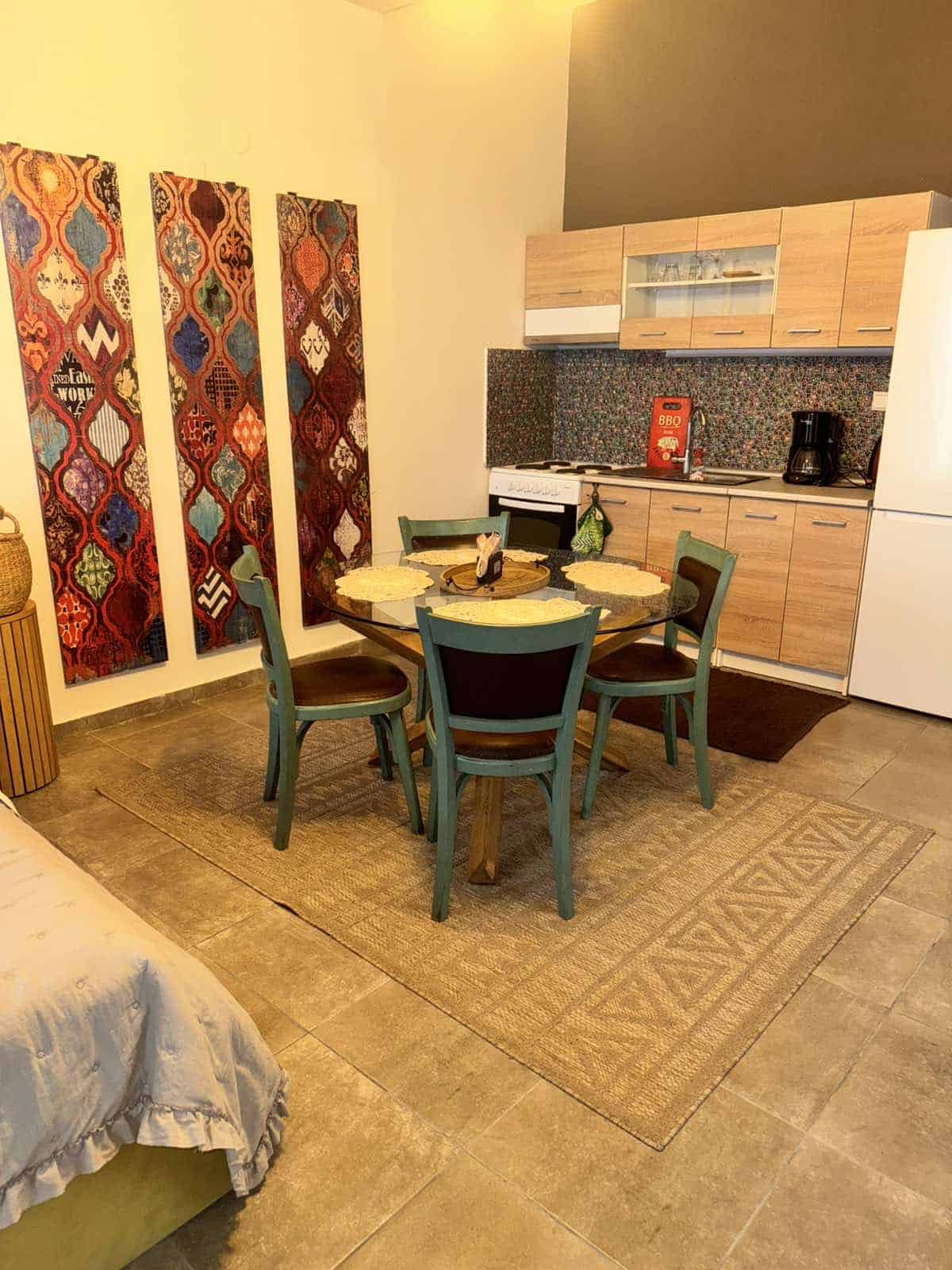 - 🍽️ Πλήρως εξοπλισμένη κουζίνα, Εστίες & ψυγείο, (σκεύη/σερβίτσια), Καφετιέρα & βραστήρας, Τραπεζαρία 4–6 ατόμων